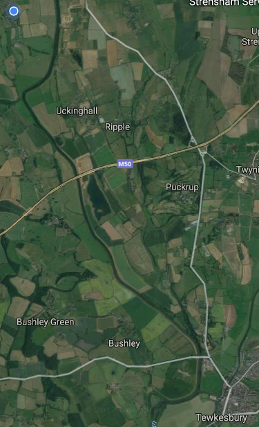 So here is the Tewkesbury to Upton map with the Severn River winding its way up the western side of the map. The M50 motorway is roughly half way.